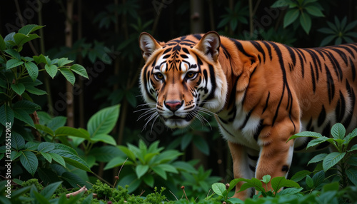 © Inna, Fototapeta premium Vivid orange tiger prowling through deep green jungle, Wildlife Day
