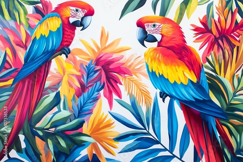 Fototapeta premium Vivid parrots amidst tropical foliage, painted in bright, bold colors on a...