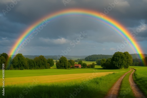 © Andefastudio, Naklejka premium Vivid Rainbow Arching Over Green Countryside with Cloudy Sky and Dirt Path
