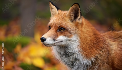 Fototapeta premium Vivid Red Fox Portrait Amidst the Majestic Autumn Forest, Capturing the Rich...