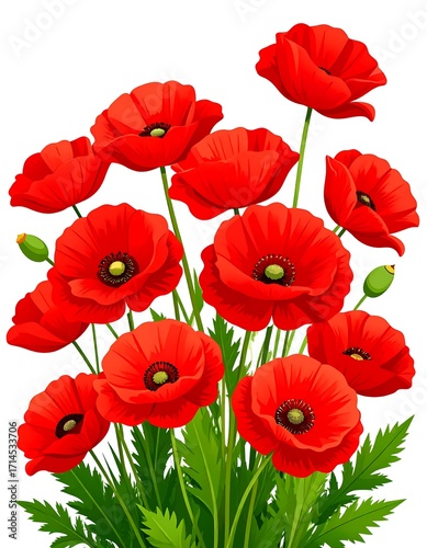 © Saidatul, Obraz premium Vivid red poppies bloom in a cluster against a pure white background.