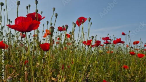 Obraz premium Vivid red poppy flower field in early summer, stretching across open meadows with bright sunlight and clear sky, captured with vibrant colors and strong seasonal atmosphere.