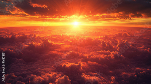 © Thanos, Obraz premium Vivid Red Sunset with Sun Rays and Clouds Viewed from Space