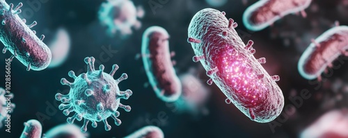 © Thamonchanok, Fototapeta premium Vivid representation of bacteria and viruses in microscopic detail.