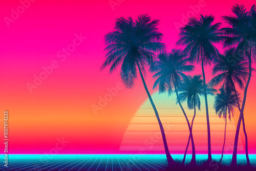 Naklejka premium Vivid retro wave gradient featuring a sunset with palm trees, evoking a...