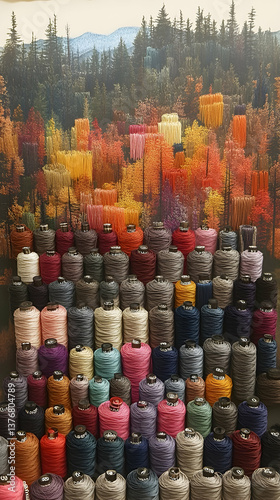 © mohadi, Fototapeta premium Vivid rows of colorful thread spools complement a painted autumn forest backdrop creating an artful display with a harm