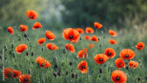 © AkuAku, Fototapeta premium Vivid scarlet poppies blooming naturally in the wilderness