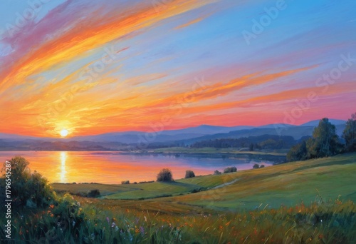 Obraz premium Vivid Sky and Sunrise (or Sunset) over Lake with Mountain Range in Background