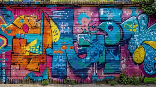 Fototapeta premium Vivid street art adorns a vibrant wall, showcasing a vibrant graffiti...