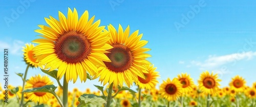 Obraz premium Vivid sunflowers bloom against a clear blue sky in a sunny, vibrant field of...