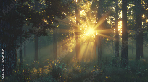 © Lotti, Naklejka premium Vivid sunrise in a tranquil forest clearing, with lush greenery and vibrant colors around.