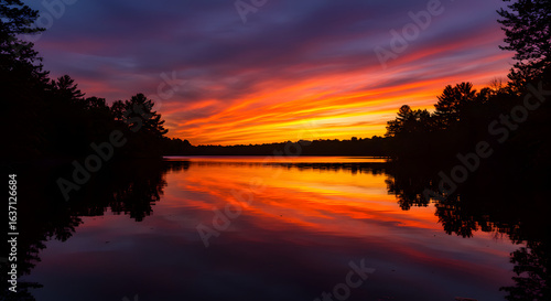 Obraz premium Vivid sunset reflected in calm lake water, framed by silhouetted trees,...