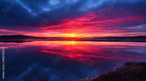 Naklejka premium Vivid sunset reflection on a tranquil lake.