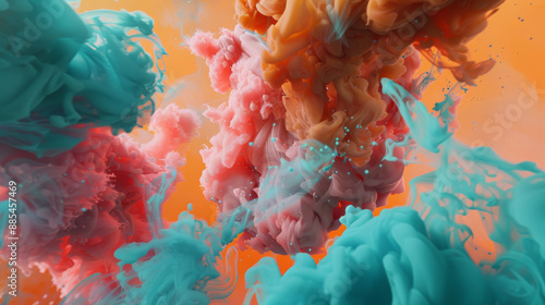 Fototapeta premium Vivid teal and peach paint clouds blend into an otherworldly abstract design,...