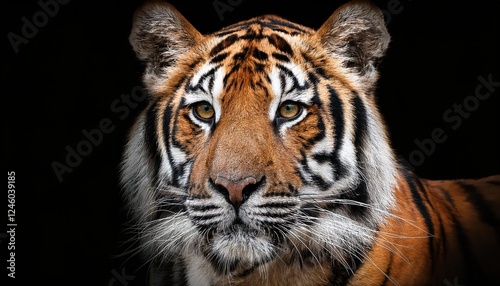Naklejka premium Vivid Tiger in Deep Black Background, Showcasing Majestic Stripes and Intense...