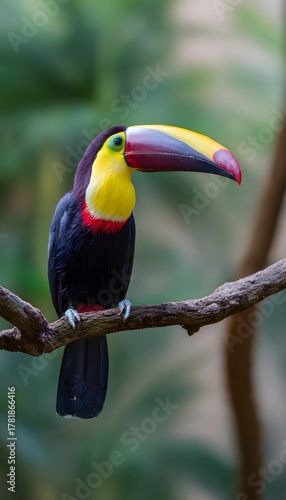 © decorator, Naklejka premium Vivid toucan perched amidst lush tropical foliage bathed in gentle morning sunlight splendor