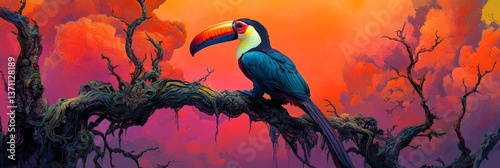 © Murda, Fototapeta premium Vivid toucan perched on gnarled branch sunset