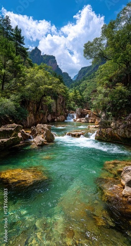 © Matahari, Fototapeta premium Vivid turquoise river flows through a rocky gorge, lush green vegetation and dramatic cliffs under a bright blue sky with fluffy clouds