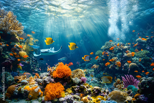 Naklejka premium Vivid Underwater Coral Reef Ecosystem: A Symphony of Marine Life and Ecological Harmony