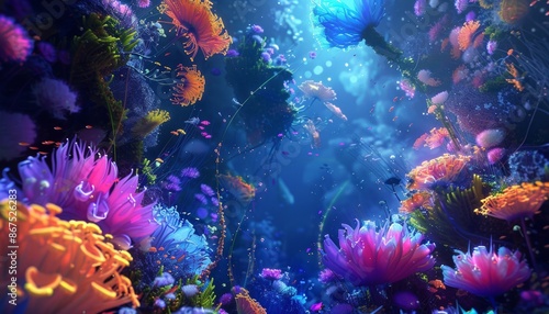 Naklejka premium Vivid Underwater Realm with Neon Colors and Surreal Plant-Like Fantastical Organisms