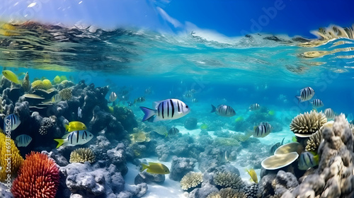 Naklejka premium Vivid underwater scene with diverse tropical fish near coral reef under sunlit water surface