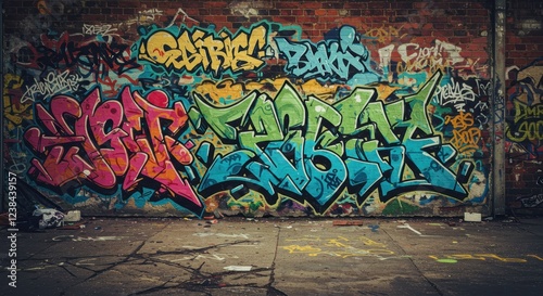 Fototapeta premium Vivid urban graffiti art on brick wall displaying colorful street creativity