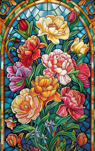 Naklejka premium Vivid Victorian Stained Glass Florals: High-Contrast Gouache Chromolithography Illustration from 1845-1895, Clean Vector Art, Centered with 50% Margin