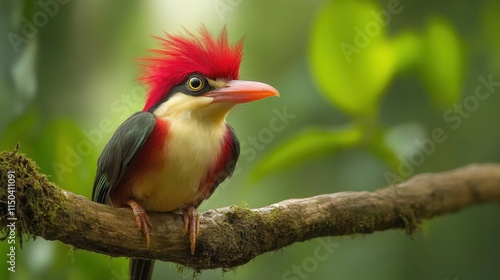 Fototapeta premium Vividly colored bird observes its surroundings while resting on a tree branch in a lush forest