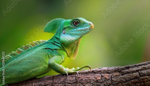 Fototapeta premium Vividly Colored Green Plumed Basilisk Lizard in a Tropical Rainforest Canopy,...