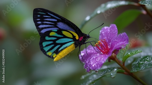© Chotijah, Fototapeta premium Vividly colored insect rests upon a purple blossom covered in droplets