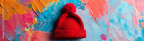 © Wida, Naklejka premium Vividly colored knitted winter hat rests upon a brightly textured abstract painting surface