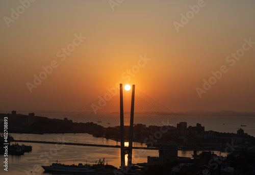 Naklejka premium Vladivostok cityscape - sunset over bridge.