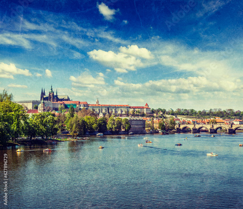 © Dmitry Rukhlenko, Obraz premium Vltava river and Gradchany (Prague Castle) and St. Vitus Cathedral and Charles bridge an people in paddle boats in the Prague, Czech Republic with grunge texture overlaid