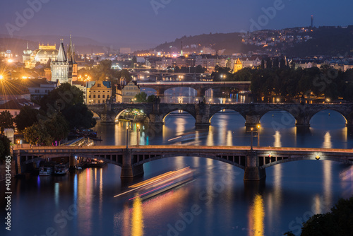Fototapeta premium Vltava River and Prague cityscape at sunset.