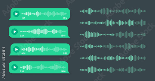 Obraz premium Voice, audio message, green speech bubble. SMS text frame. Social media chat or messaging app conversation. Voice assistant, recorder. Sound wave pattern. Dark mode. Vector illustration