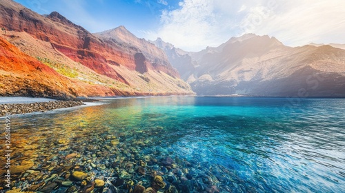 © Husna, Obraz premium Volcanic beach, Tenerife, clear water, mountains reflecting in turquoise water