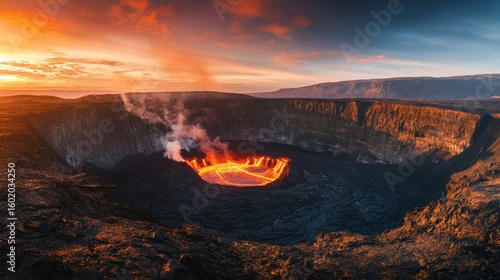 Fototapeta premium Volcanic crater at sunrise with molten lava.