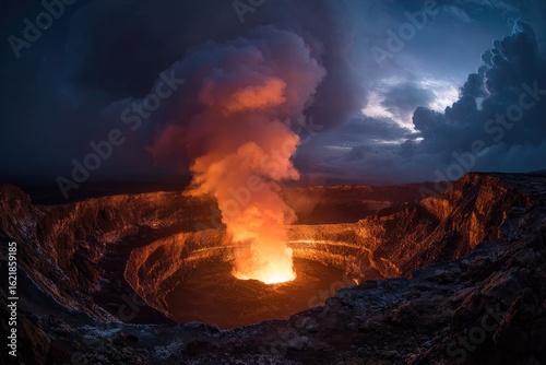 © Ikbal, Fototapeta premium Volcanic crater erupting at night