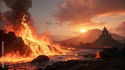 Fototapeta premium volcanic eruption with flowing lava near an ancient temple at sunset, dramatic natural disaster and breathtaking landscape scene