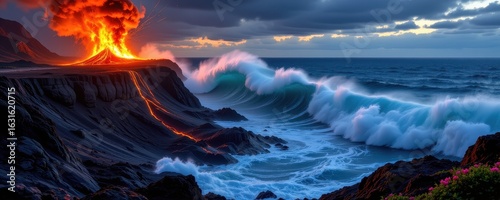 © Thi, Naklejka premium volcanic eruptions under or near oceans can cause tsunamis by displacing water rapidly especially if the eruption leads to caldera collapse or pyroclastic flow into the sea