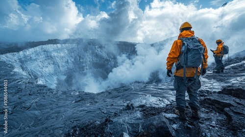 © CRISPIFLY, Obraz premium Volcanic Exploration Scientists Studying Active Crater