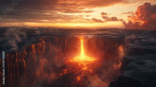 © adiba, Fototapeta premium Volcanic fissure, fiery lava flow, sunset sky, epic landscape, digital art