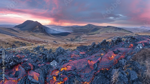 © BerkahStock, Obraz premium Volcanic landscape at sunset, showing solidified lava flows in foreground with mountains and dramatic sky in background.