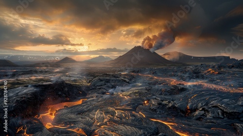 Fototapeta premium Volcanic landscape with active volcano, lava flows, dramatic sunset, and two...