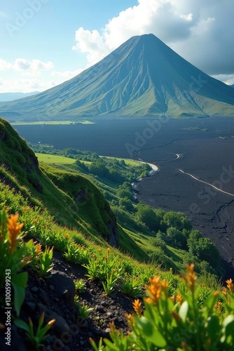 © Patthama, Fototapeta premium Volcanic landscape with lush greenery and unique wildlife, galapagos, endemic species, planet