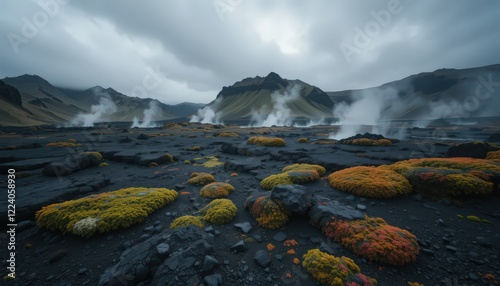 © Pixsite, Fototapeta premium Volcanic landscape with vibrant plant life and steam rising.