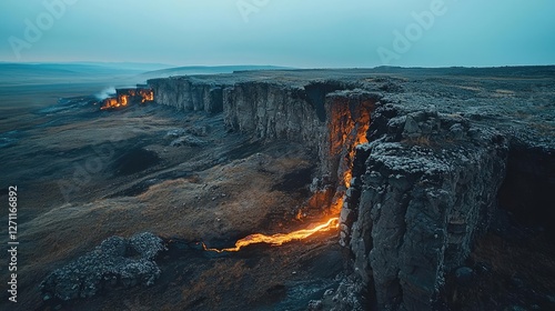 Fototapeta premium Volcanic landscapes concept. A mesmerizing view of a lava flow across a rugged volcanic landscape at twilight.