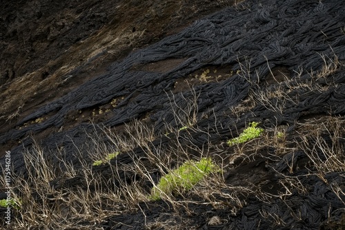Fototapeta premium Volcanic Lava Flow: A stark, black volcanic lava flow with sparse vegetation struggling to grow
