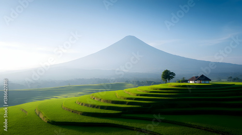 Fototapeta premium Volcanic Mountain and Rice Terraces at Sunrise