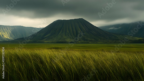Fototapeta premium Volcanic Mountain Landscape With Green Field